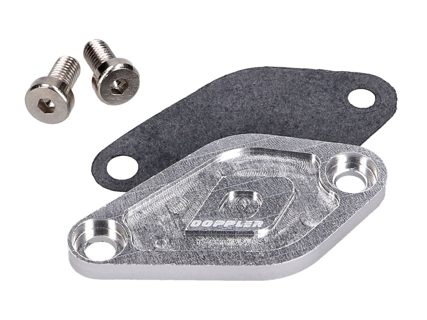 Silberfarbige Abdeckung für die Ölpumpe vom französischen Tuningspezialisten Doppler passend für Schaltmoped mit Minarelli AM oder Derbi / Piaggio EBE, EBS, D50B Motor. Lieferung inklusive Dichtung und Schrauben. Einfach auszutauschen und ein tolles kleines Detail für legales Optiktuning.